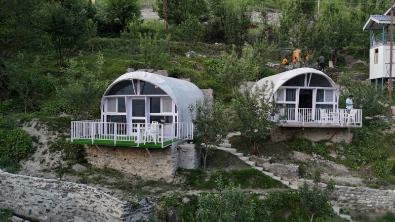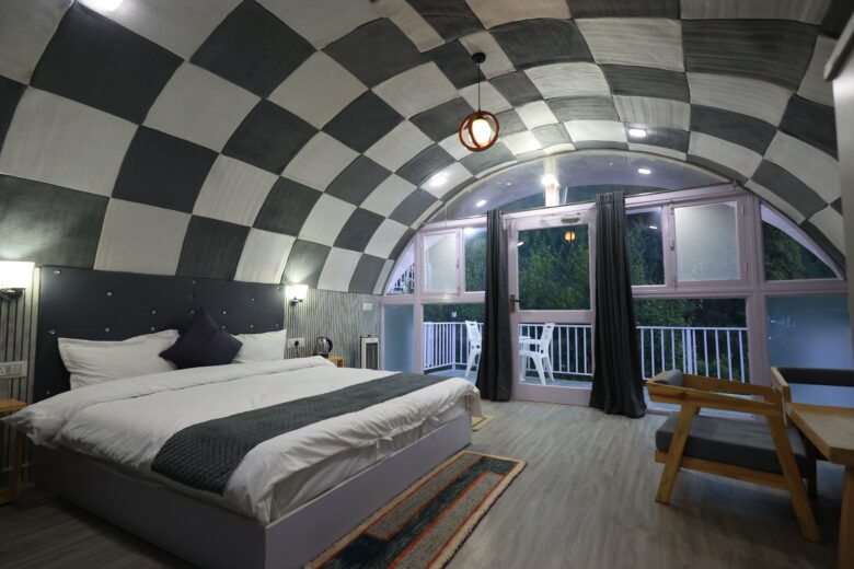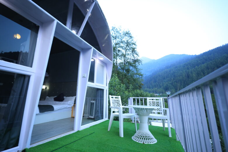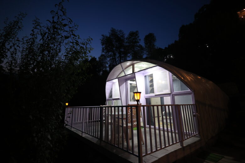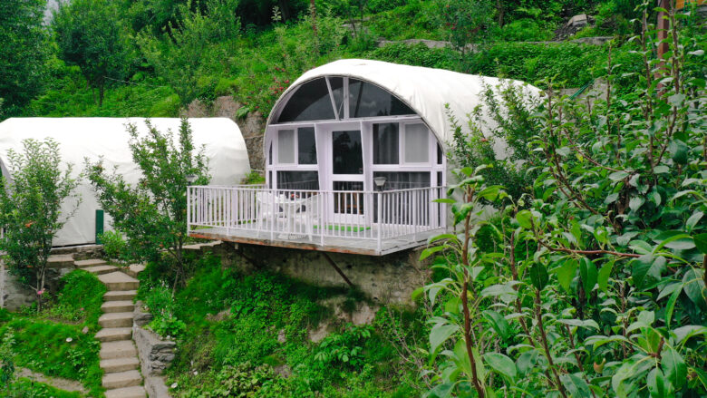 Scenic hillside dome located on the upper valley side, surrounded by cedar trees with a private sit-out deck and peaceful mountain ambience for couples.